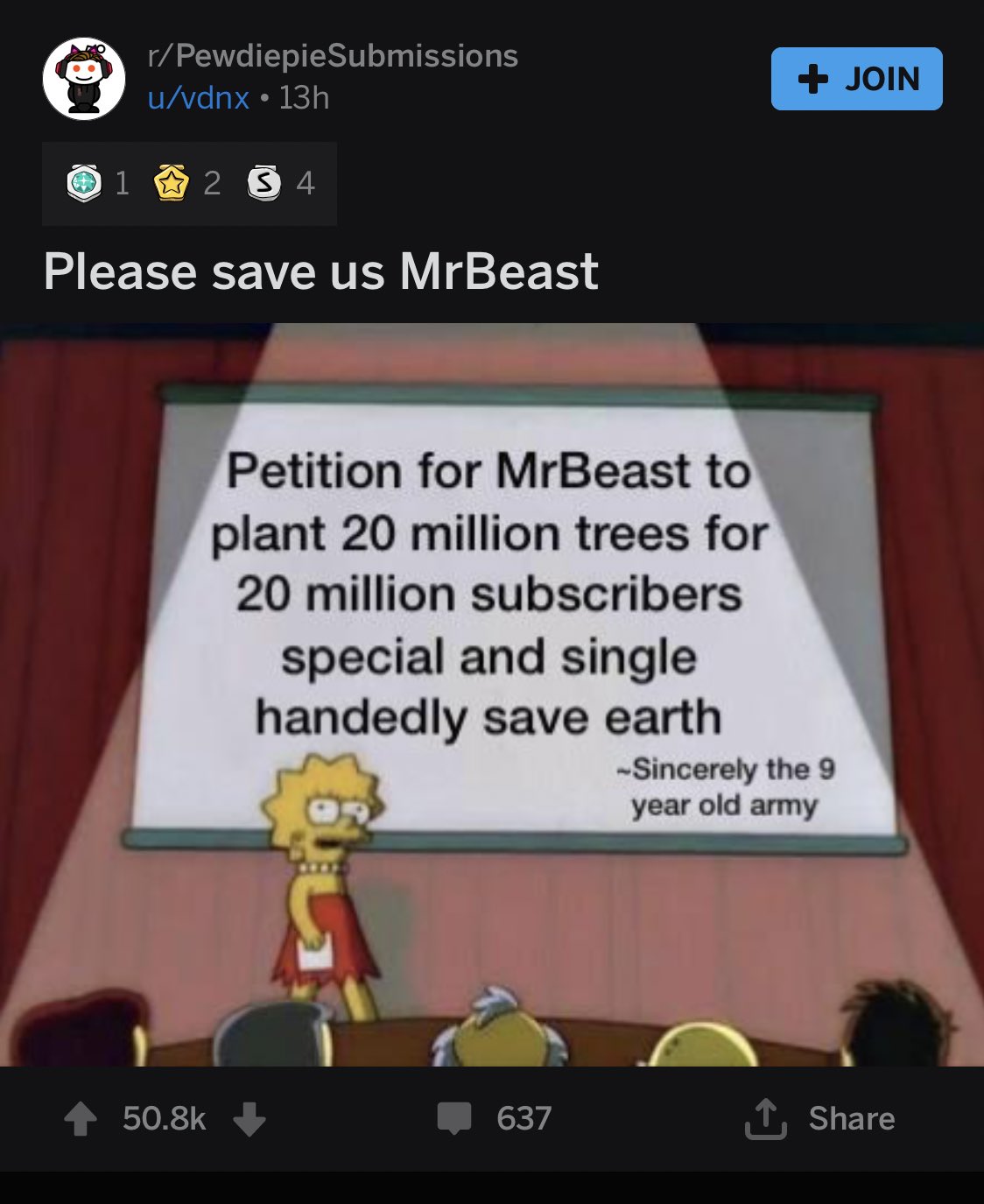 Mrbeast On Twitter Reddit Really Wants Me To Plant 20 Million Trees Https T Co Pegsq3ebjo Twitter